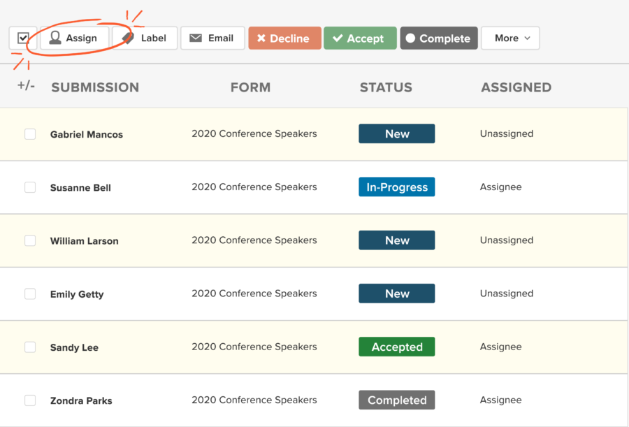 Make assignments. Automatically assign submissions to your team to review based on specific criteria, or manually distribute submissions as they arrive.